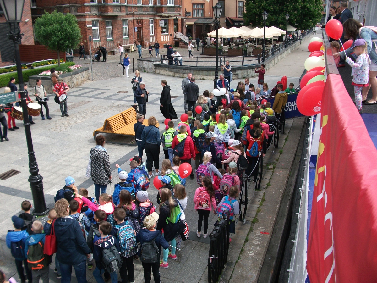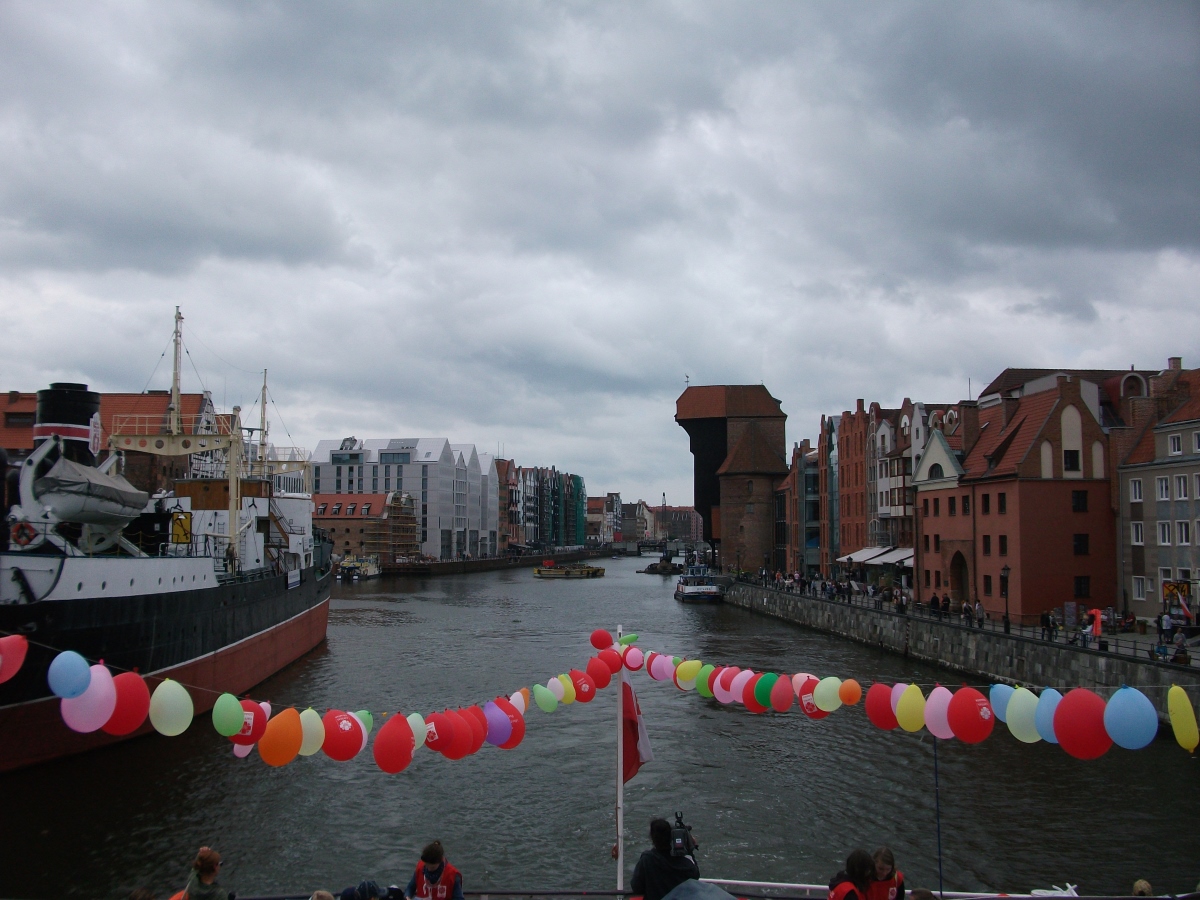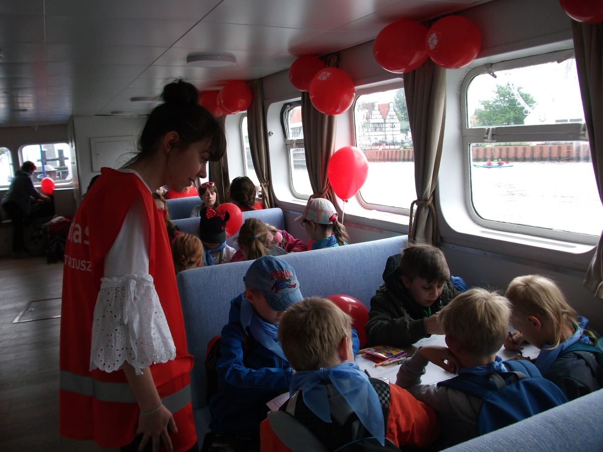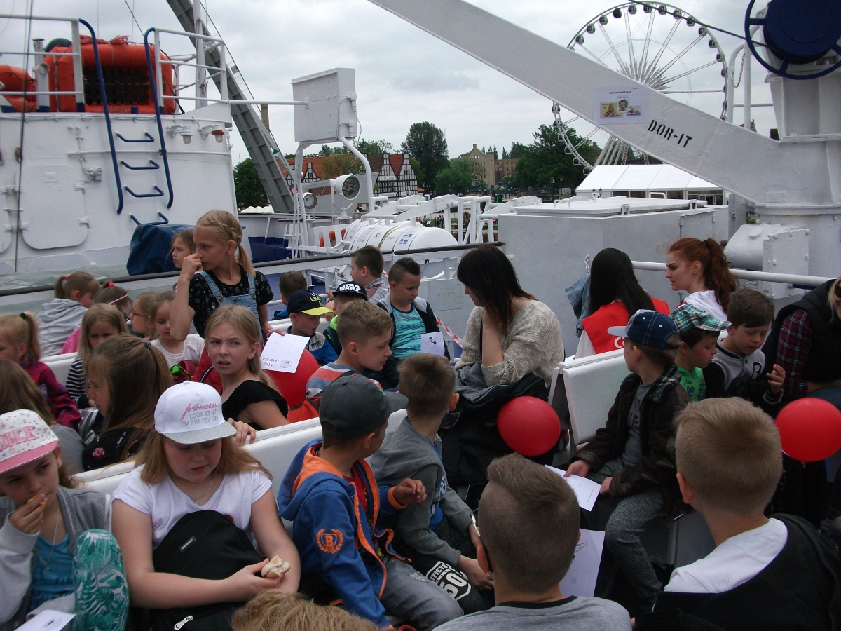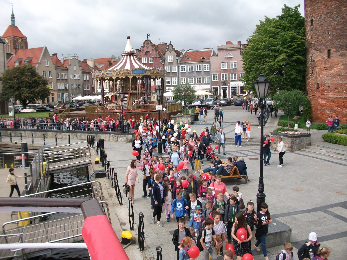 Było głośno, kolorowo i … smacznie. Głośno, gdyż barwny korowód przeszedł ulicami Głównego Miasta, od Bazyliki Mariackiej na statek. Na początku szli bębniarze, a za nimi kilkaset uradowanych dzieci. A było kolorowo, bo mnóstwo czerwonych, żółtych i zielonych balonów zawisło na katamaranie Rubin. Było także smacznie i słodko, ponieważ dzieci otrzymały pyszne i świeże drożdżówki.