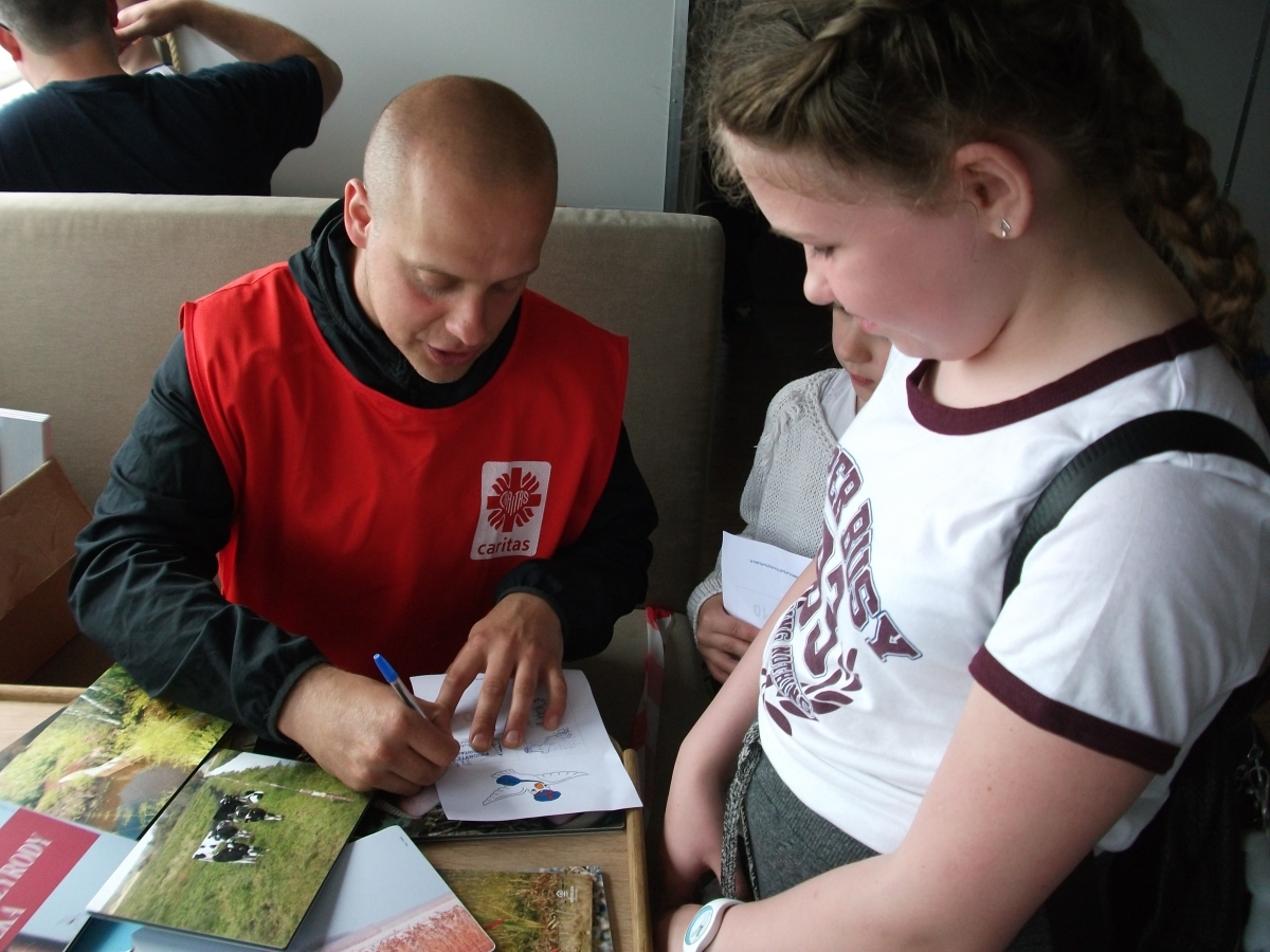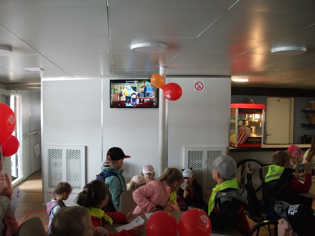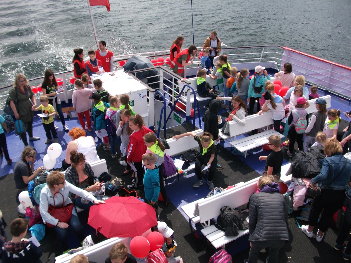 Dla wielu najmłodszych mieszkańców województwa pomorskiego była to pierwsza podróż katamaranem po wodach Zatoki Gdańskiej. Z zapartym tchem z pokładu statku podziwiali mijane widoki. Poza widokami, były także gry, konkursy i zabawy. Kilkunastu wolontariuszy Caritas Archidiecezji Gdańskiej otoczyło dzieci swoją opieką. Zorganizowali dla nich różne quizy i zagadki. Nie zabrakło także pracowników WFOŚiGW w Gdańsku, którzy zabrali ze sobą Rodzinę Pomorskich. I było ich widać i słychać. Sympatyczni Pomorscy spoglądali na uczestników rejsu z plakatów, można było obejrzeć także filmy animowane z ich udziałem. Pomorscy sprawdzali, czy dzieci potrafią poprawnie segregować odpady, czy wiedzą jak poruszać się po rezerwatach, jakie funkcje pełnią torfowiska, a także dlaczego warto samochód zastąpić rowerem. Do naszego koła fortuny z zagadkami i atrakcyjnymi nagrodami ustawiała się chyba najdłuższa kolejka na statku! Cieszy fakt, że edukacja ekologiczna przekazywana w ciekawy sposób budzi takie zainteresowanie najmłodszych!