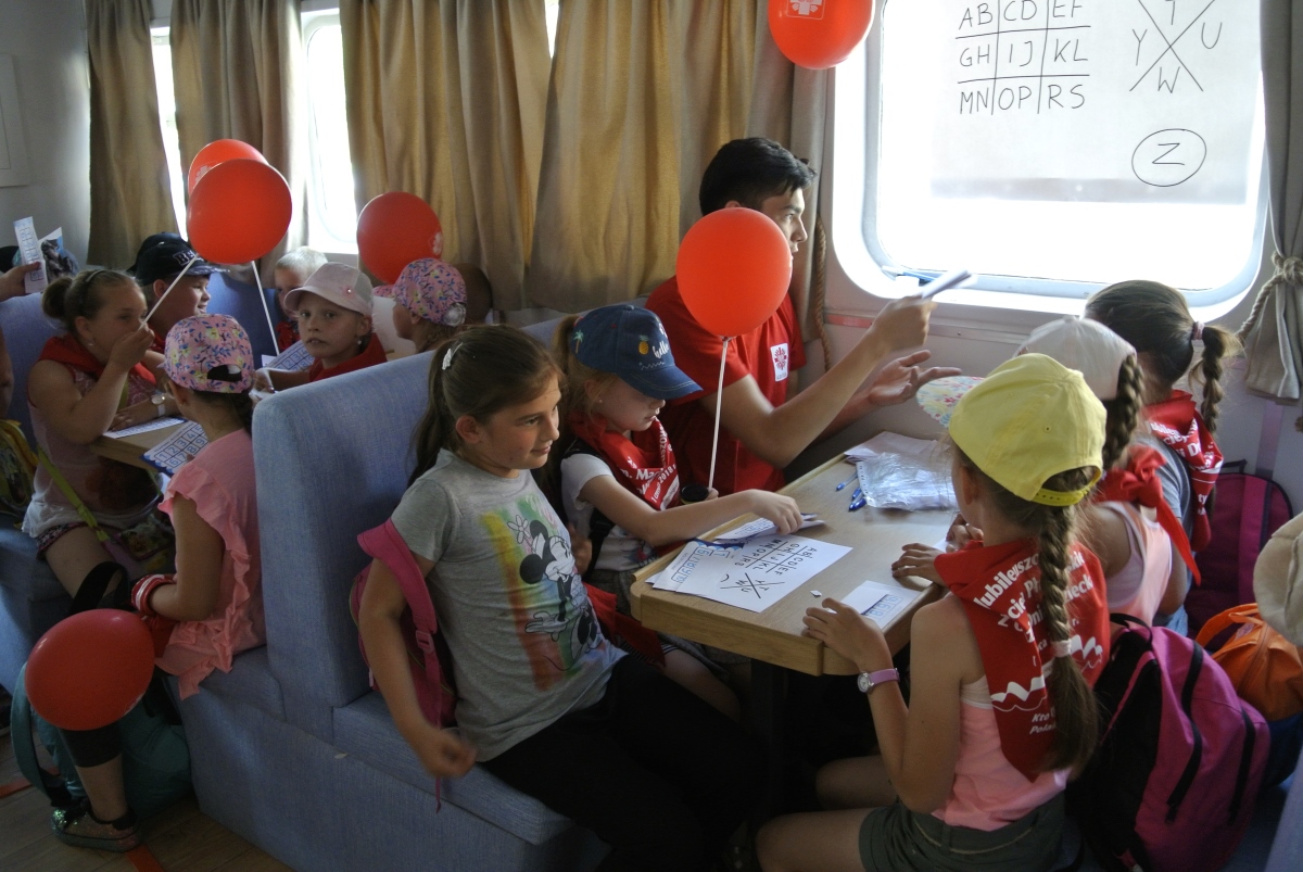 Na statku na najmłodszych czekało już kilkunastu wolontariuszy Caritas Archidiecezji Gdańskiej. A wraz z nimi konkursy, quizy i gry. Pytania konkursowe związane były z 100 rocznicą odzyskania przez Polskę Niepodległości oraz edukacją ekologiczną. Dzieci rozpoznawały gatunki ryb żyjące w Bałtyku oraz gatunki ptaków i ssaków występujących na polskim wybrzeżu. Dowiedziały się także, jakie odpady najczęściej wyławiane są z morza i ile trwa czas ich rozkładu.