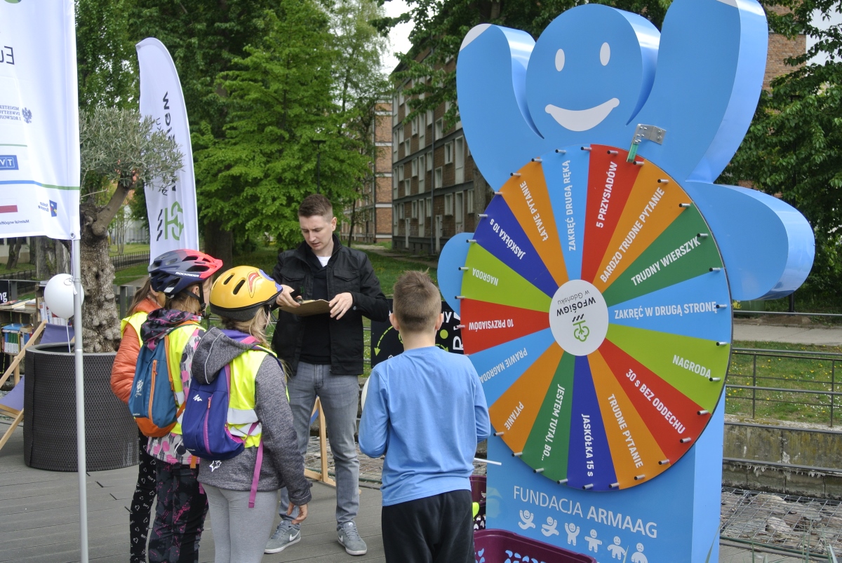 Każda osoba, która przyjechała do nas rowerem, hulajnogą lub na rolkach otrzymała upominek. Namawiamy bowiem do tego, aby jak najczęściej zamiast samochodu wybierać ekologiczne środki transportu. Dla miłośników literatury przygotowaliśmy kącik bookcrossingu. Ciekawe książki można było przeczytać na miejscu lub zabrać ze sobą do domu. Jak zwykle, dużym zainteresowaniem cieszyło się koło fortuny. Dzięki tej grze edukacyjnej, nasi goście poszerzyli swoją wiedzę na temat transportu ekologicznego, zastosowania odnawialnych źródeł energii oraz związku naszych codziennych wyborów z jakością powietrza.
